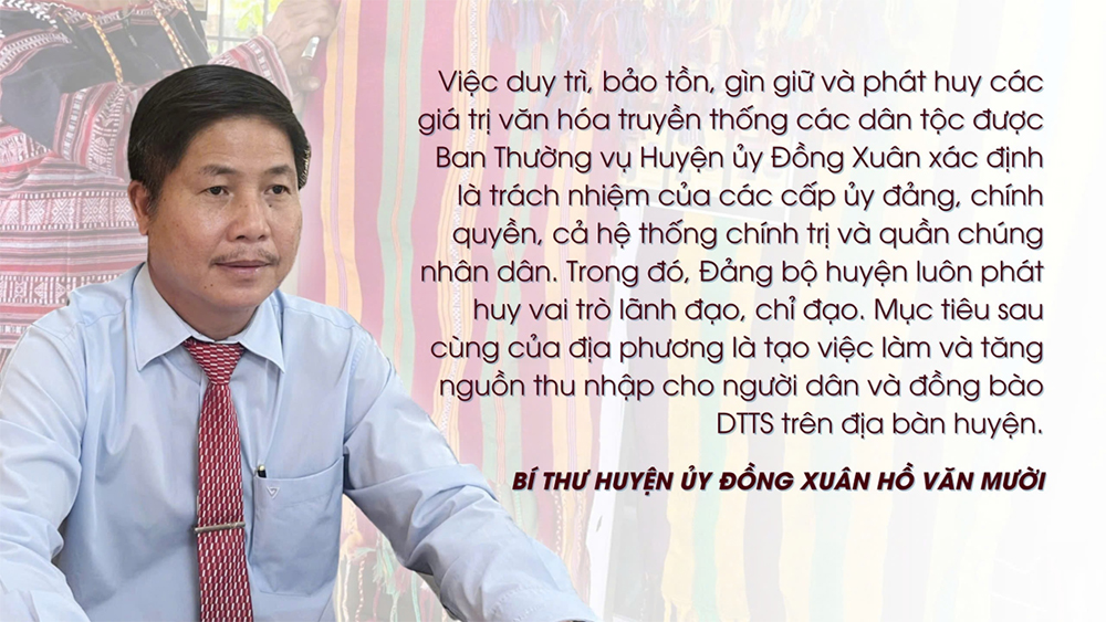Huyện miền núi Đồng Xuân hiện có 18 dân tộc anh em cùng sinh sống; trong đó, đồng bào dân tộc thiểu số (DTTS) chiếm 19,5% dân số toàn huyện. Ban Thường vụ Huyện ủy Đồng Xuân luôn xác định: Việc duy trì, bảo tồn và gìn giữ và phát huy các giá trị văn hóa truyền thống các dân tộc là trách nhiệm của các cấp ủy đảng, UBND các cấp, cả hệ thống chính trị và quần chúng nhân dân trên địa bàn huyện.Trong đó, Đảng bộ huyện Đồng Xuân luôn phát huy vai trò lãnh đạo, chỉ đạo; UBND huyện và các ngành chức năng cụ thể hóa thành các chương trình, chính sách bảo tồn, phát huy giá trị văn hóa đồng bào DTTS và hướng tới khai thác nguồn lực văn hóa theo hướng bền vững.