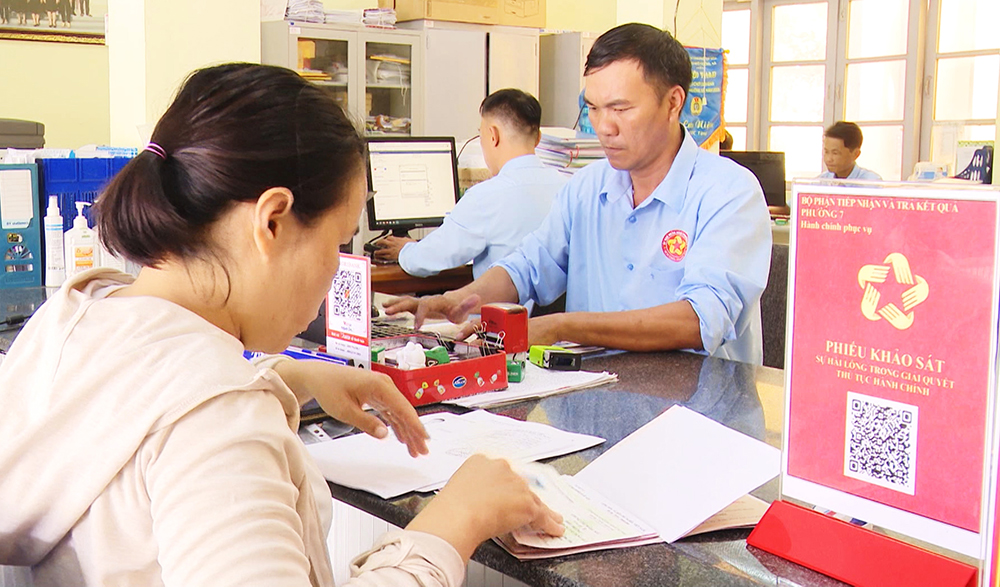 | Tại BPMC phường 7 (TP Tuy Hòa) công khai phiếu khảo sát sự hài lòng trong giải quyết TTHC bằng việc mã quét đánh giá. Ảnh: THÙY THẢO |