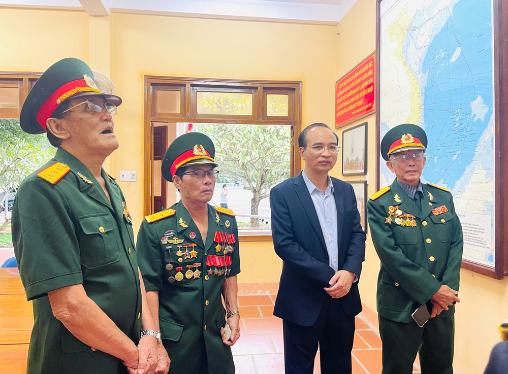 | Các đồng chí nguyên chiến sĩ Đại đội K60 làm nhiệm vụ bảo vệ bến Vũng Rô - tàu Không số về thăm lại di tích Vũng Rô. Từ trái sang: Thượng úy Tống Trọng Điểm, trung úy Ngô Minh Thơ, đồng chí ở Cục Hậu cần - Kỹ thuật (Bộ Quốc phòng) và thiếu tá Ngô Văn Định, Trưởng ban liên lạc Bến tàu Không số Vũng Rô. Ảnh: TRẦN QUỚI |